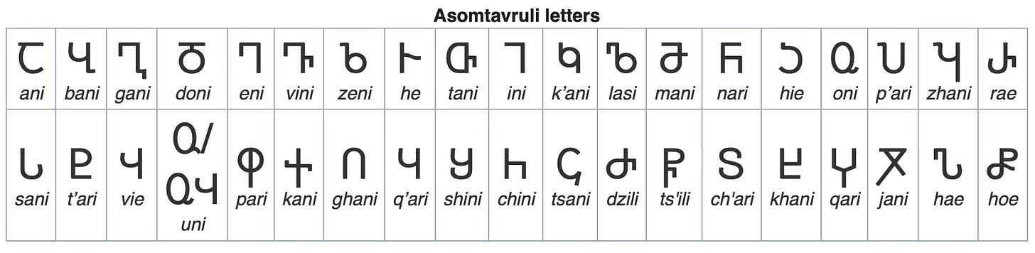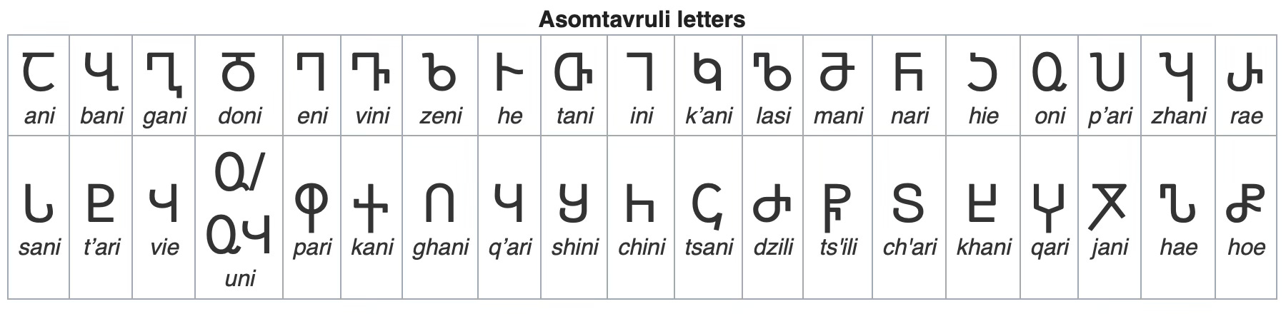 Asomtavruli, meaning “capital letters”, is the oldest of the three Georgian scripts and goes back to at least the early 5th century. It was created with only one case (ie, no lowercase) since carving onto stone and clay were the only forms of preservation at a time when authority mattered and literacy was limited.