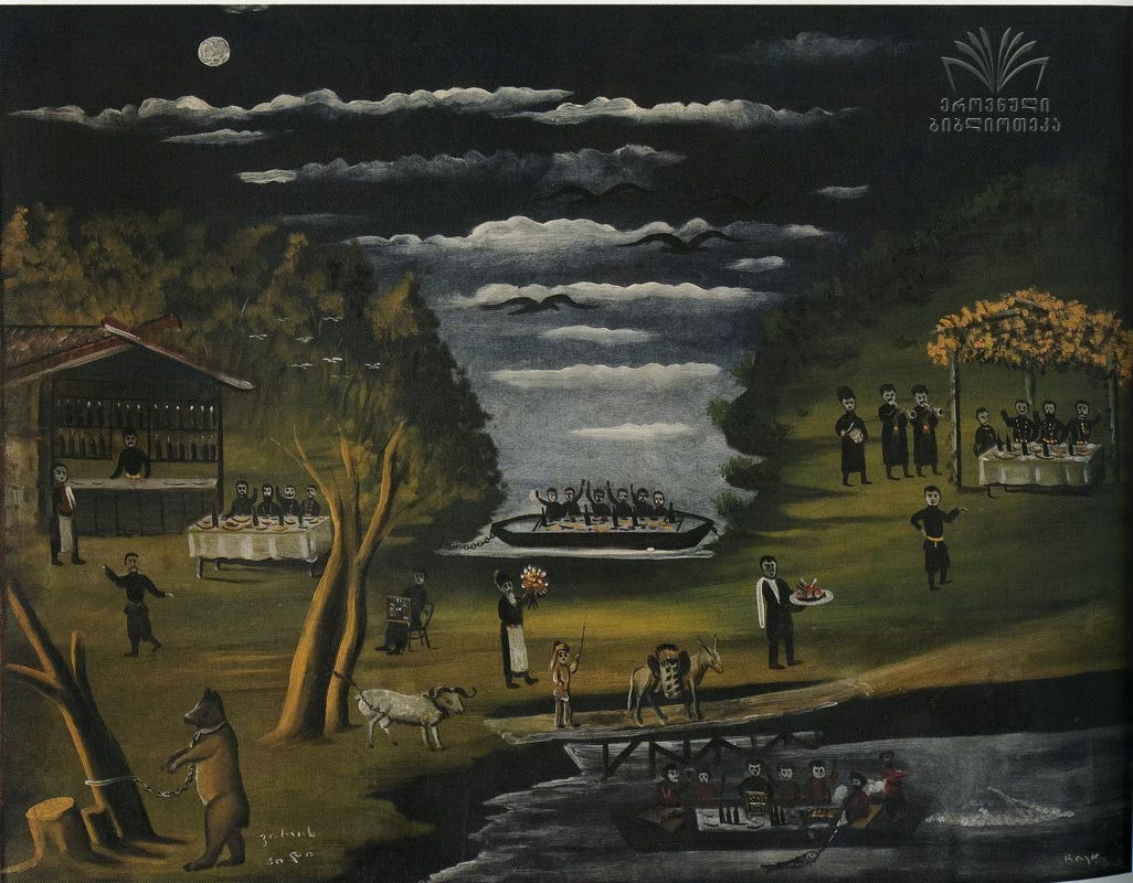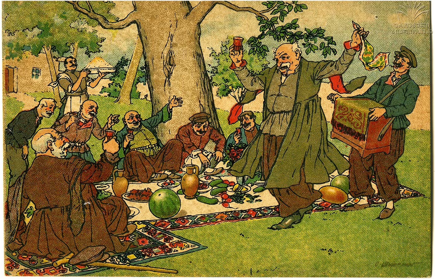 Ortachala was never just a garden suburb or a site of leisure. It was a working landscape and a social commons, where irrigation canals, vineyards, and market gardens coexisted with music, drink, poetry, and spectacle. Figures like the kinto and the qarachoğeli moved through this space in different ways, embodying the textures of old Tbilisi’s urban culture.