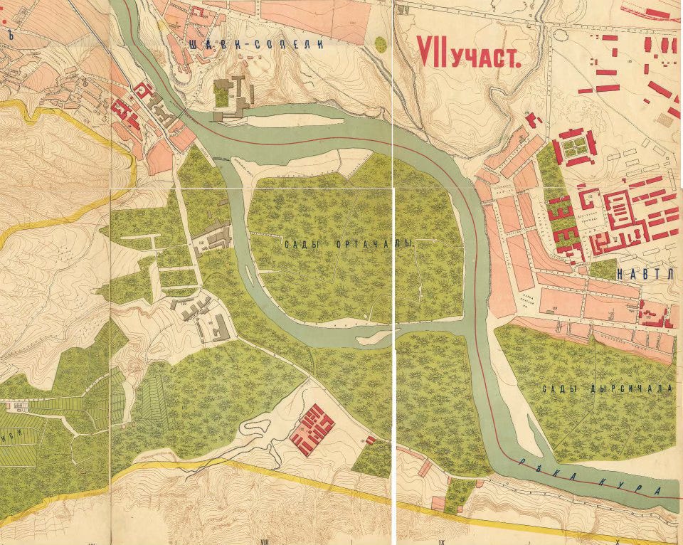 The largest and most well-known of them - Ortachala Island - sat where the river split into branches, just south of the city. The first time it was given a name was in 1735, on the map of Prince Vakhushti Bagrationi, the Georgian geographer and historian. There, it appears as the Krtsanisi Garden, named after the nearby district of Krtsanisi to which the land was administratively attached. Following the death of King George XII in 1800 and the removal of Prince David Batonishvili from Georgia one year later, the royal gardens passed out of dynastic hands. At first, they were ecclesiastically owned and, soon after, entered into the hands of Tbilisi’s merchant class.
